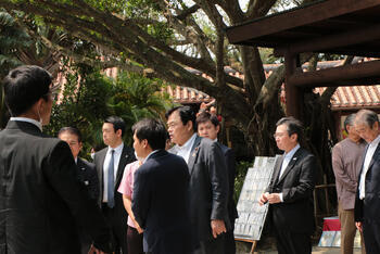 令和2年3月30日、赤羽一嘉国土交通大臣をはじめ田端浩観光庁長官は当社が運営する「おきなわワールド」を視察。琉球王国城下町や南都酒造所、琉球ガラス王国工房 などを訪問し激励しました。 世界的な新型コロナウィルスの影響が続き、観光需要が落ち込む中、一日も早く沖縄観光がV字回復に向け、取り組めるよう力強い言葉を頂きました。